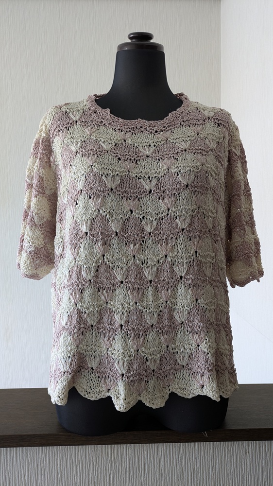 棒針編みの穴あき模様と編機でメリアス編みをした後身頃